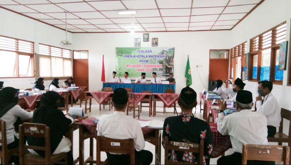 Nglipar (MTsN 7 Gunungkidul) — Berdasarkan SK Ditjen Pendis No. 1111 Tahun 2019 tentang Petunjuk Teknis Penilaian Kinerja Kepala Madrasah, MTsN 7 Gunungkidul melaksanakan Penilaian Kinerja Kepala Madrasah di madrasah setempat dengan dihadiri Tim asesor dari Bidang Dikmad Kanwil Kemenag DIY dan Kabupaten Gunungkidul, Pengawas Madrasah, Komite, dan seluruh stakeholder madrasah, Rabu (21/10/2020).