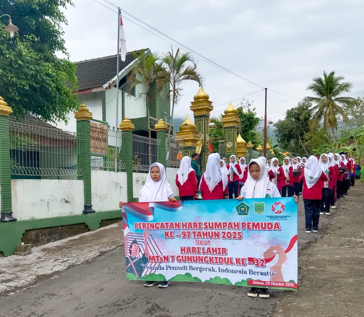 Nglipar (MTsN 7 Gunungkidul) — Keluarga besar MTsN 7 Gunungkidul menggelar kegiatan Jalan Sehat pada Selasa (28/10/2025) dalam rangka memperingati Hari Lahir (Harlah) ke-32 madrasah sekaligus Hari Sumpah Pemuda ke-97. Kegiatan yang menempuh rute di sekitar lingkungan madrasah ini menjadi ajang kebersamaan sekaligus sarana refleksi atas perjalanan panjang lembaga dalam dunia pendidikan.
