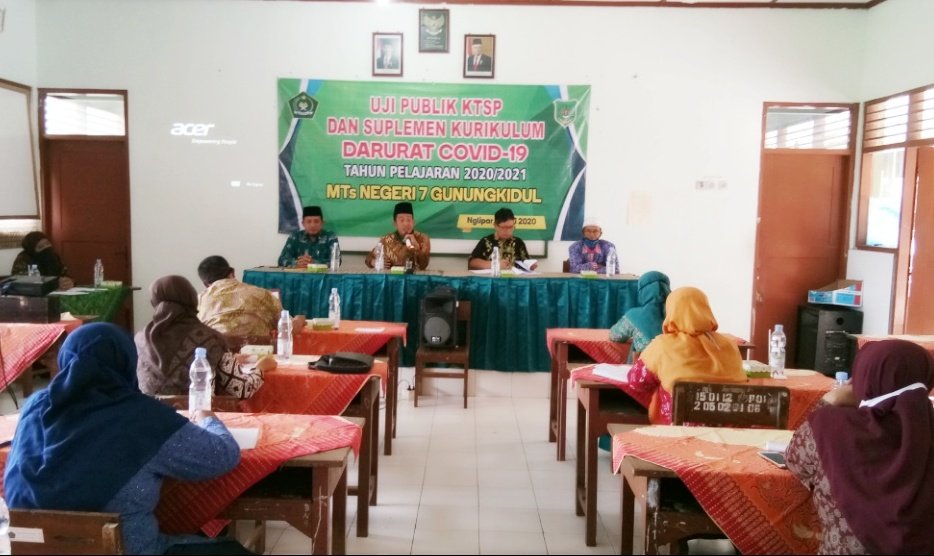 Nglipar (MTsN 7 Gunungkidul) – Dalam rangka memaparkan dan mempresentasikan visi misi dan tujuan dari kurikulum Madrasah, serta komponen lain yang berkaitan dengan kegiatan belajar mengajar untuk tahun pelajaran 2020/2021, MTsN 7 Gunungkidul melaksanakan Uji Publik KTSP dan Suplemen Kurikulum Darurat Covid-19. Kegiatan ini dilaksanakan di Lab IPA dengan di hadiri Kasi Dikmad Kemenag Gunungkidul, Pengawas Madrasah, Komite Madrasah dan seluruh stakeholder Madrasah, Kamis (19/7/2020).