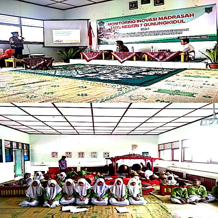 Madrasah Tsanawiyah Negeri 7 Gunungkidul menerima kunjungan Tim Pusdiklat Tenaga Teknis Pendidikan dan Keagamaan Badan Litbang dan Diklat Kementerian Agama Republik Indonesia pada Hari Kamis (29/12/2022) di Ruang madrasah setempat.  Kegiatan tersebut dihadiri oleh Tim Pusdiklat Kementerian Agama RI, Pengawas Madrasah, Kepala Madrasah,  Stakeholder MTsN 7 Gunungkidul, Komite Madrasah dan Grup Sekar Mad7u (Seni Karawitan MTsN 7 Gunungkidul) dengan tujuan untuk monitoring dan evaluasi kegiatan peserta yang telah mengikuti  pelatihan inovasi madrasah.