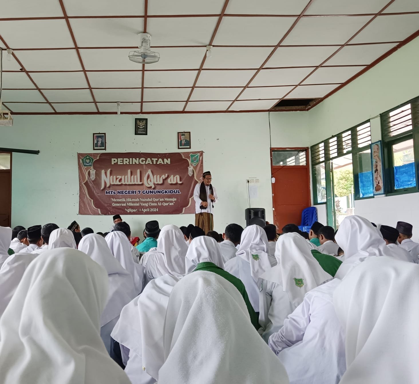 Nglipar (MTsN 7 Gunungkidul) — Bertempat di Lab IPA MTsN 7 Gunungkidul peringatan Nuzulul Qur’an dengan tema Memetik Hikmah Nuzulul Qur’an Menjadi Generasi Milenial Yang Cinta Al-Quran. Kegiatan yang dihadiri oleh seluruh siswa MTsN 7 Gunungkidul pada Senin (1/4/2024) dengan tujuan agar para siswa madrasah menjadi generasi milenial yang mencintai Al-Quran.