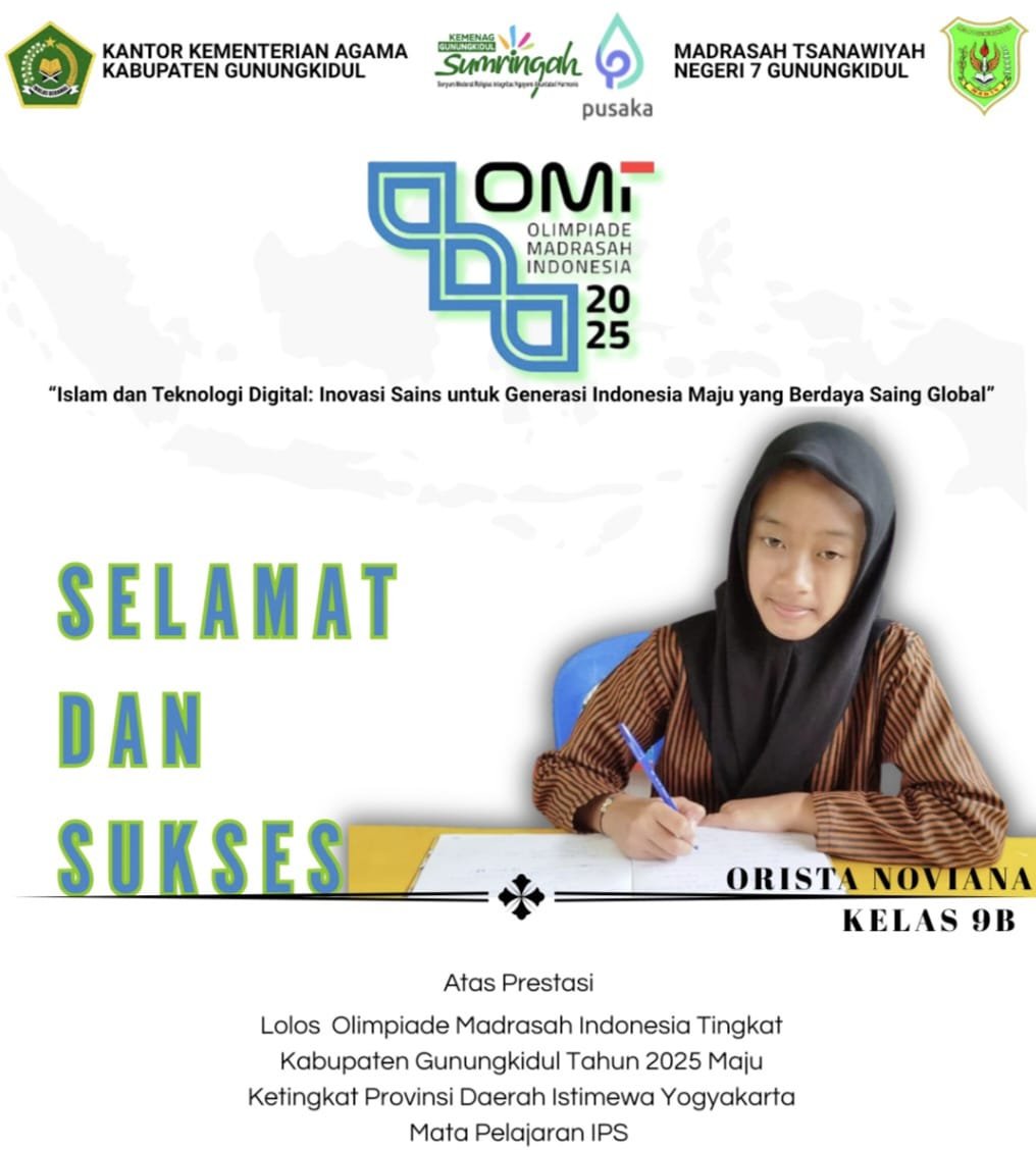 “Selamat dan sukses untuk ananda Orista Noviana yang sudah belajar giat sehingga dapat maju ke tingkat Provinsi pada OMI tahun 2025, semoga dibabak selanjutnya dapat menorehkan prestasi,” harap Dedy Mustadjab, S.Pd MA, Kepala MTsN 7 Gunungkidul.