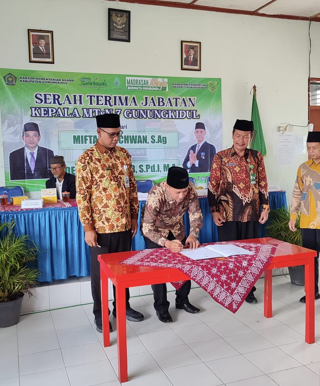 Nglipar (MTsN 7 Gunungkidul) — MTsN 7 Gunungkidul melaksanakan acara serah Terima Jabatan Kepala Madrasah di madrasah setempat pada Jumat, (11/7/2025). Kegiatan ini dihadiri oleh Kepala Kantor Kemenag Kabupaten Gunungkidul H. Mukotip S.Ag M.Pd.I, Pengawas Madrasah, Kepala MTsN 7 Gunungkidul lama, Kepala MTsN 7 Gunungkidul baru, Bapak/Ibu guru, tenaga kependidikan dan tamu undangan.