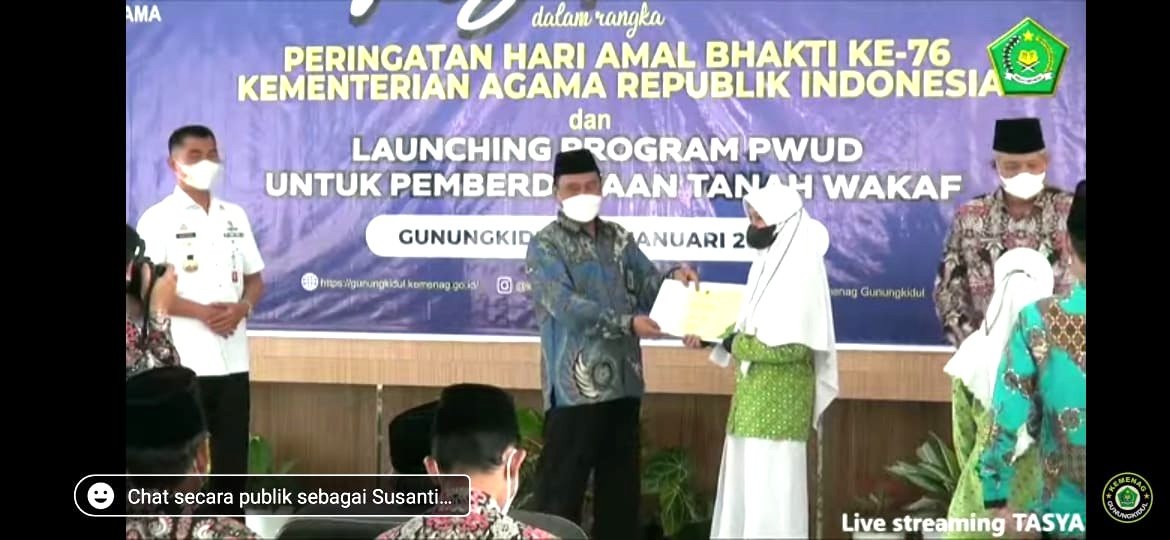 Wonosari (MTsN 7 Gunungkidul) — Sebagai bentuk apresiasi, Kantor Kementerian Agama Kabupaten Gunungkidul memberikan penghargaan kepada ASN dan siswa berprestasi. Penghargaan ini diberikan pada Acara Tasyakuran Hari Amal Bhakti ke-76 Kementerian Agama Republik Indonesia dan Launching Program PWUD Untuk Pemberdayaan Tanah Wakaf di Gedung PLHUT Kantor Kementerian Agama Kabupaten Gunungkidul, Rabu (12/1/2022). Turut hadir Kakanwil Kemenag DIY, Kepala Kankemenag Gunungkidul, Bupati Gunungkidul dan tamu undangan.