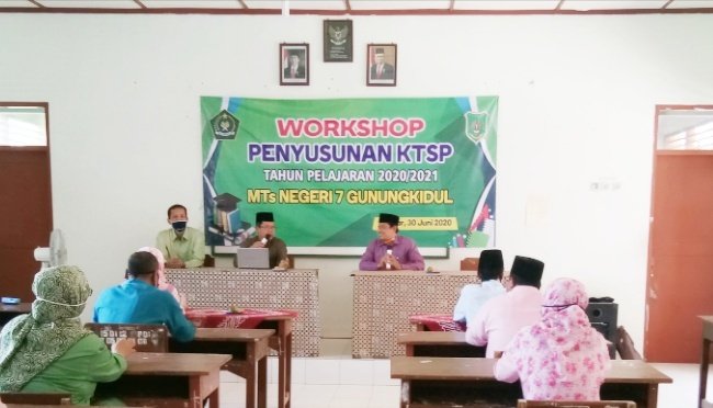 Nglipar (MTsN 7 Gunungkidul) – Sebagai tindak lanjut Review KTSP tahun pelajaran 2019/2020 yang telah dilaksanakan Sabtu (27/6/2020), MTsN 7 Gunungkidul mengadakan worshop penyusunan KTSP tahun pelajaran 2020/2021 yang dilaksanakan di LAB IPA madrasah setempat dengan dihadiri pengawas madrasah dan seluruh stakeholder madrasah, Selasa (30/6/2020). Kegiatan ini dilaksanakan sesuai dengan SK Dirjen Pendis Nomor 6981 Tahun 2019 tentang Juknis Penyusunan Kurikulum tingkat Madrasah Tsanawiyah (MTs).